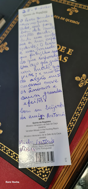 No interior de um dos livros, estava um marcador, oferecido por uma amiga minha, com dedicatória: "O livro, sendo o mesmo para todos, uns percebem dele muito; outros, pouco; outros, nada; cada um conforme a sua capacidade. O livro é um mudo que fala, um surdo que responde, um cego que guia, um morto que vive, e, não tendo ação em si mesmo, move os ânimos e causa grandes efeitos." Padre António Vieira.